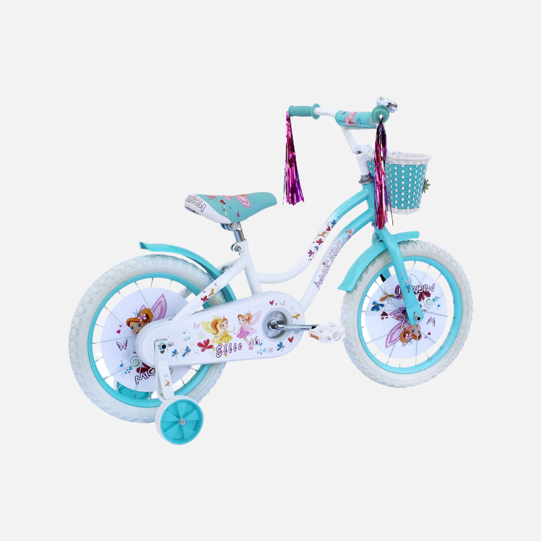 The Micargi Ellie stands out in our children’s bike series as a top choice for beginners. This 16" bike features a hi-ten steel frame, BMX-style "box" handlebars, and training wheels, making it perfect for young riders. Its vibrant and unique color combinations are sure to attract attention, and it includes full fenders and a front basket for your child's belongings.